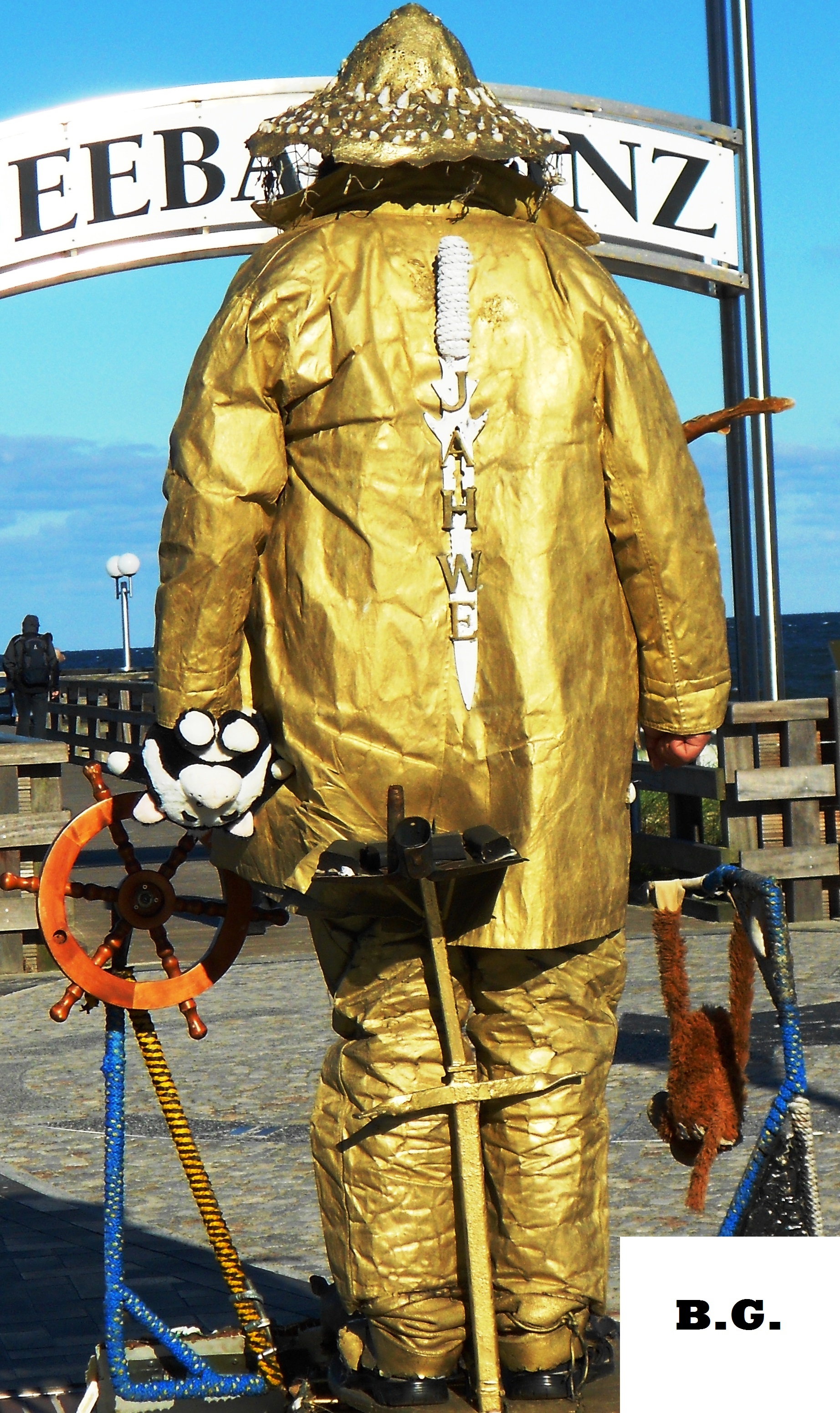 Über dem Schauspiel thront einer, unbeweglich und mit stiller Miene. Er ist golden gekleidet und auf seinem Rücken prangt auf weißem Schwert „Jahwe“, der Name Gottes. Thront er wirklich über allem? Golden und still, der unbewegte Beweger, wie es die alten Denker schon behaupteten? Oder ist er selbst bewegt, bewegt sich in allem, was sich bewegt? Tanzt auf den Wellen. Der Geist Gottes schwebte über dem Wasser. Das wird greifbar. Der Lebendige, der Gott des Lebenden, der bewegte Beweger.